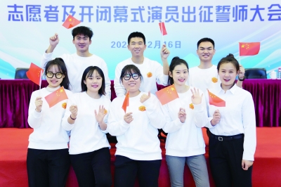 北京体育大学的学生志愿者于依鹭(前排左二)在北京体育大学体育馆内与志愿者同学合影。 于依鹭是北京体育大学中外体育人文交流专业研究生,她将作为媒体运行专业志愿者服务北京冬奥会。她说:“希望能在服务中实践我平时的所学,并有所提高、有所收获。”随着北京2022年冬奥会临近,北京各高校学生志愿者积极参与培训,提高志愿服务水平,用专业的态度、饱满的热情、青春的笑脸,迎接来自世界各地的宾朋,为冬奥盛会贡献青春力量。 新华社记者 鞠焕宗/摄
