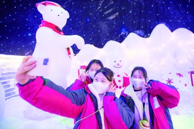 12月21日,市民在冰雪艺术节现场自拍合影。当日,“圆梦冬奥、同享未来”第八届全国大众冰雪季冰雪艺术节在武汉光谷国际网球中心开幕。现场布置了充满荆楚文化特色的冰雕展览、冰雪互动等项目,让人们感受冰之美、雪之趣。新华社记者 肖艺九/摄