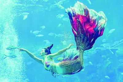 12月21日,首届中国美人鱼表演赛参赛选手在比赛中。 当日,由国家体育总局水上运动管理中心等单位主办的首届中国美人鱼表演赛在海南三亚亚特兰蒂斯开赛,共吸引来自国内的40余位选手参赛。新华社记者 蒲晓旭/摄
