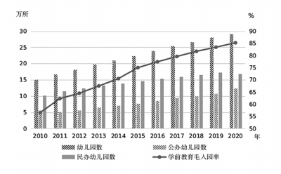 1.学前教育加快发展。《纲要》实施以来,连续实施三期学前教育行动计划,不断扩大普惠性资源供给,提升保育教育质量,目前基本建成广覆盖、保基本、有质量的学前教育公共服务体系。2020年,全国学前教育毛入园率为85.2%,比2010年提高28.6个百分点,远高于《纲要》“达到70%”的目标。全国共有幼儿园29.2万所,其中公办幼儿园12.4万所,民办幼儿园16.8万所,分别是2010年的1.9倍、2.6倍和1.6倍。全国共有幼儿园专任教师291.3万人,是2010年的2.5倍。