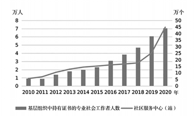2010—2020年社区服务中心(站)数和基层组织中持有证书的专业社会工作者人数