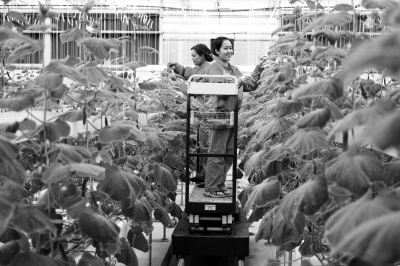 图为工人们在温宿国家农业科技园区智能温室管理反季节蔬菜。颜寿林/摄