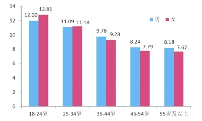 18-64岁女性平均受教育年限为9.41年,男性为9.66年,分别比2010年增长0.61和0.57年。18-24岁女性的平均受教育年限为12.81年,比2010年增长1.85年,比55岁及以上女性高5.14年,比同年龄段男性高0.81年(见图3)。教育的地区差距缩小,西部农村女性平均受教育年限为7.44年,比2010年增长2.04年,与东部农村女性平均受教育年限的差距由2010年的0.9年缩短为0.61年。