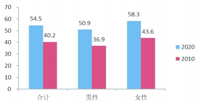 女性参与社会组织的比例显著提升,在社会组织中的影响力明显增强。至少参与一种社会组织的女性比例为27.4%,比2010年提高12.5个百分点;其中18-24岁女性参与比例最高,为46.7%,比同年龄段男性高8.2个百分点。在社会组织中担任负责人的女性比例由2010年的37.6%提高到2020年的46.6%。