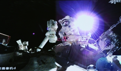 ▲ 12月26日,在北京航天飞行控制中心拍摄的神舟十三号航天员叶光富出舱画面。 新华社记者 郭中正/摄