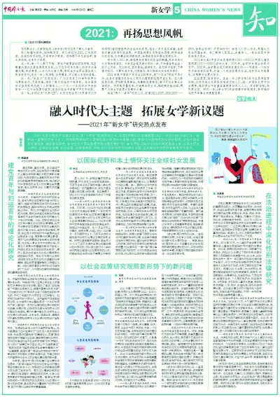 《在新发展格局中推动妇女儿童事业高质量发展》解读新“两纲”在新时代新要求新期待之下的变与不变。《提高女性生殖健康水平策略措施中的伦理问题》从伦理学角度讨论“生殖健康和优生优育知识全面普及,促进健康孕育”新目标。《构建政策评估机制 增强家庭发展能力》论证了构建家庭政策评估机制的必要性。《面向妇女开展专项普法 持续提升妇女法治素养》分析妇女普法工作的特点与积极意义。《“学校-家庭-社会”协同合力促进性别平等教育》则探讨了构建协同促进性别平等教育模式的原则和实践路径。