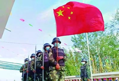 记者离开时,护边巡逻沿线,巾帼姐妹在迎风飘扬的五星红旗映衬下,格外醒目!