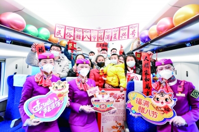 农历腊八节到来之际,在中国铁路成都局集团有限公司贵阳客运段动车一队值乘的C5980次“复兴号”动车组列车上,列车工作人员邀请旅客品尝腊八粥、张贴“福”字、悬挂灯笼,感受传统文化魅力。 新华社记者 杨文斌/摄