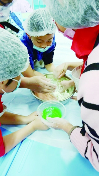 同学们戴上厨师帽、围上围裙,铺开桌布,洗干净手,整个过程充满“仪式感”。营养师王阿青提醒说,制作食物是庄重而富有情感的,不仅要求卫生规范,还要将餐饮礼仪文化注入其中,切不可随意应付、胡乱搭配。“同学们和出的面有的太硬、有的偏软,都要找找原因,是水加多了?还是揉搓发酵不到位?这里面又有哪些物理和化学反应?”王阿青不断引导孩子们思考做面中的各种知识。
