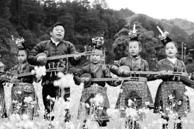 1月7日,在贵州省黔东南苗族侗族自治州榕江县寨蒿镇太平校园外的油菜花田,歌师、党员吴家文在给学生传授弹唱侗族琵琶歌。 自2021年以来,随着“双减”政策的深入实施,榕江县各学校聘请当地民间艺人到学校开展“民俗课堂”,给学生开设弹唱侗族琵琶歌、民族手工艺刺绣等民俗特色拓展课程,激发学生对传统文化的兴趣,将非遗文化延续传承,促进学生全面发展。