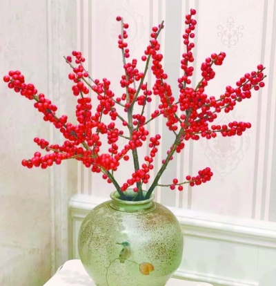 近年来,果实类插花的风头颇盛,果实寓意丰收,一簇簇圆球也很讨喜。比如,北美冬青,原是欧美圣诞节的代表,如今却火成一抹中国红,颇有古意盎然的气韵。冬青可中可洋,且花期长,3天换一次水就可,果子少就疏朗,果子密就热烈,随手一插都好看极了。花市里传统的中国红冬青盆栽,过年过节摆放家中,增色不少;“便携版”冬青很受年轻人喜欢,不仅自带透明小花瓶,价格也更亲民。