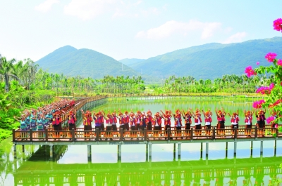 不远处的亚龙湾国际玫瑰谷,花田里一派生机勃勃,头戴斗笠的老乡们正在紧张劳作。花丛中的一块标语牌上,“小康不小康,关键看老乡”10个大字,向人们诉说着曾经发生在这里的温暖故事。