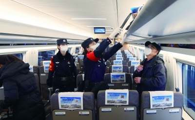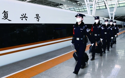 近日,由上海铁路公安处乘警支队5名女民警组成的女子乘警组亮相京沪高铁“复兴号”,开始执行列车值勤任务。在春运期间,她们每人将承担近5万公里的高强度值乘工作,保障旅客平安出行。 新华社记者 凡军/摄