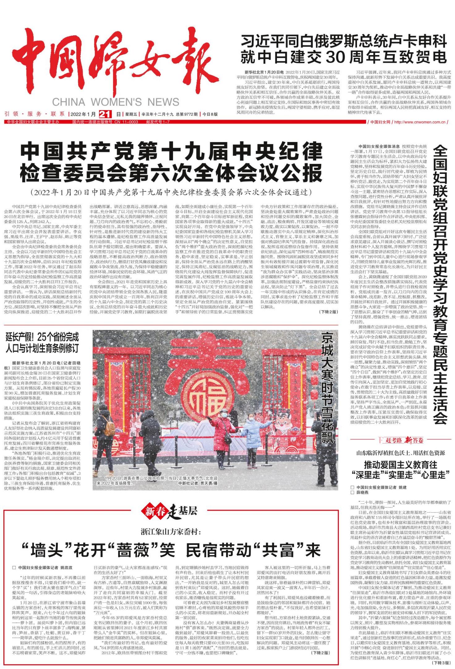 中国妇女报全媒体消息 按照党中央统一部署,1月17日,全国妇联党组召开党史学习教育专题民主生活会,以中央政治局专题民主生活会为标杆,紧扣大力弘扬伟大建党精神,坚持和发展党的百年奋斗历史经验,坚定历史自信,践行时代使命,厚植为民情怀,勇于担当作为,团结带领广大妇女坚定不移听党话、跟党走,为实现第二个百年奋斗目标、实现中华民族伟大复兴的中国梦不懈奋斗这一主题,紧密结合思想和工作实际,深入查摆问题,进行党性分析,严肃认真开展批评和自我批评,有针对性地提出努力方向和整改措施。党组书记黄晓薇主持会议并作总结讲话。党史学习教育中央第13指导组组长张德霖到会指导并作点评讲话,中央组织部、中央纪委国家监委驻全总机关纪检监察组有关同志到会指导。