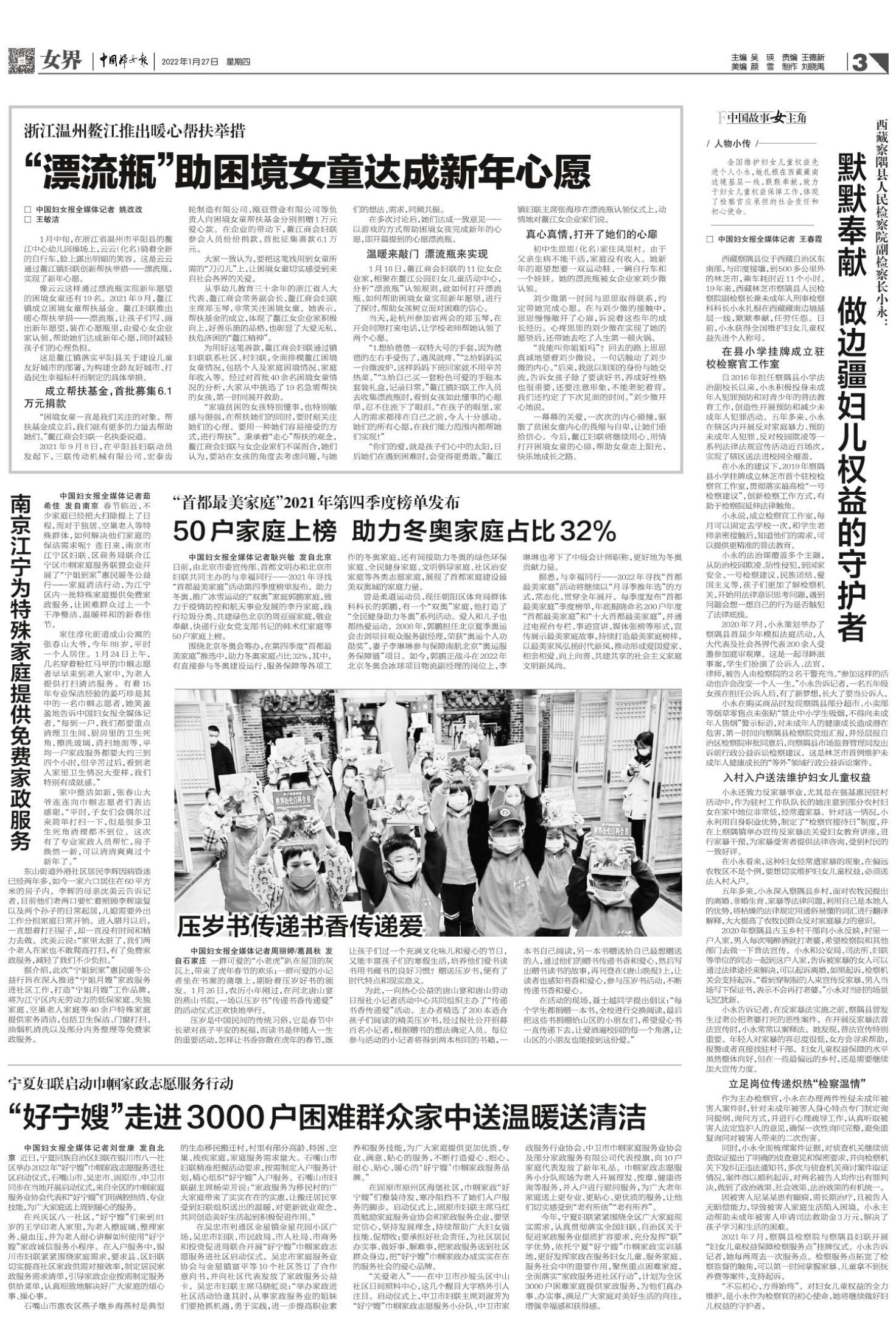 《中国妇女报》(电子版)的一切内容(包括但不限于文字、图片、PDF、图表、标志、标识、商标、版面设计、专栏目录与名称、内容分类标准以及为读者提供的任何信息)仅供中国妇女报读者阅读、学习研究使用,未经中国妇女报及/或相关权利人书面授权,任何单位及个人不得将《中国妇女报》(电子版)所登载、发布的内容用于商业性目的,包括但不限于转载、复制、发行、制作光盘、数据库、触摸展示等行为方式,或将之在非本站所属的服务器上作镜像。否则,中国妇女报将采取包括但不限于网上公示、向有关部门举报、诉讼等一切合法手段,追究侵权者的法律责任。