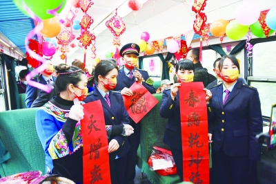 1月26日,列车乘务员展示对联和福字。当日正值南方小年,在从湖南怀化开往澧县的7266次列车上,列车乘务员利用休班时间,为旅客送上对联、福字,直播带货腊肉、冰糖橙等当地农产品,邀请旅客唱山歌,一同欢度小年。7266次列车是穿行于武陵山区的“慢火车”,全程300多公里,历时9个多小时,逢站即停。新华社记者 陈振海/摄