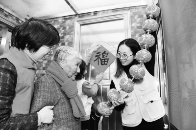 2022年1月27日,江苏省太仓市浏河镇政府工作人员、社工组织和社区志愿者来到当地闸北社区94岁高龄的空巢独居老人张杏娣家中,帮助老人家中张贴春联、打扫卫生,陪老人一起吃“年夜饭”。
