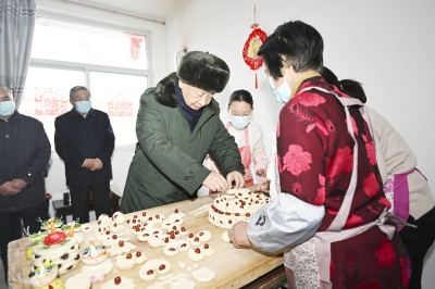 师红兵家4间窑洞去年因强降雨全部倒塌,在政府补助和各方援助下重建了2间装配式住房,目前全家已经入住。习近平仔细察看院落、住房。看到师红兵一家正在做年馍,习近平加入进来,捏了一个枣花,并为面团点上红枣。欢声笑语中,一个个年馍制作出来,格外喜庆。