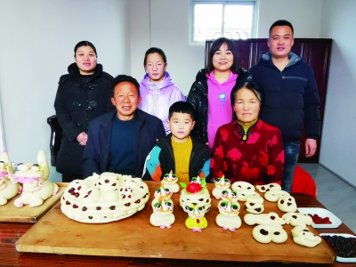 在师红兵家灾后重建的新房中,师红兵的爱人朱海丹和儿媳、孙女三代人正在制作当地传统食品——霍州年馍,桌上摆满了面团和红枣、红豆、黑豆等各种制作年馍的材料。