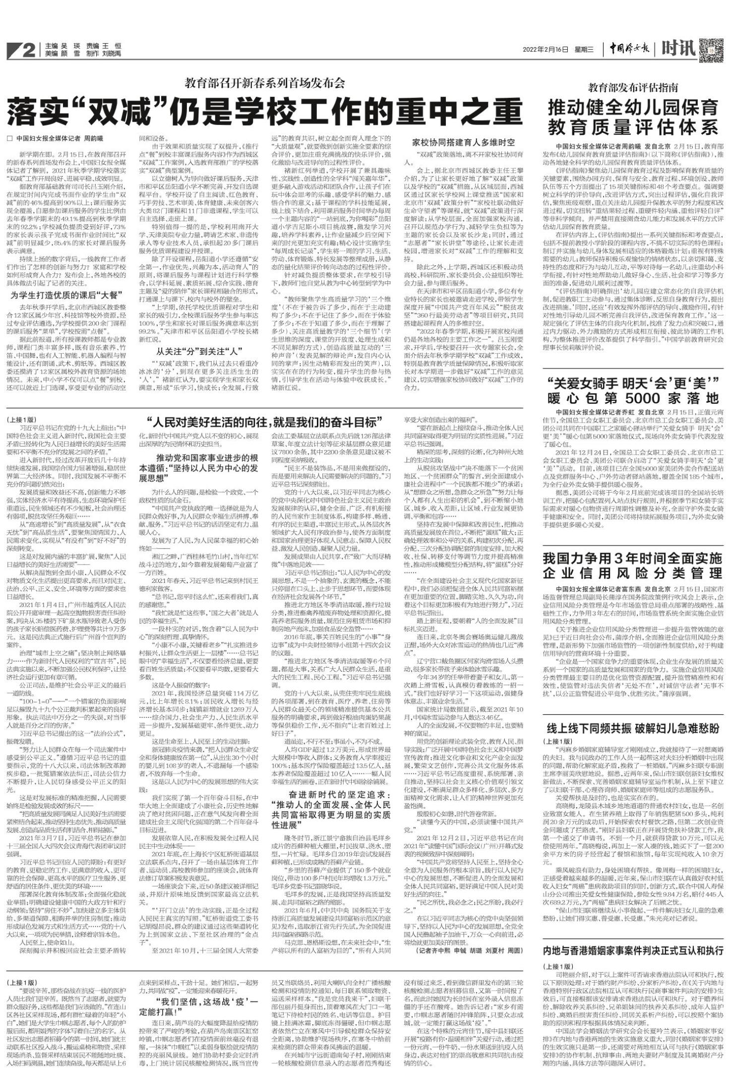 中国妇女报全媒体记者周韵曦 发自北京 2月15日,教育部发布《幼儿园保育教育质量评估指南》(以下简称《评估指南》),推动各地健全科学的幼儿园保育教育质量评估体系。
