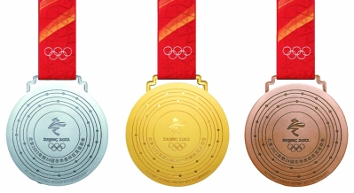 北京冬奥会的“同心”奖牌,以殷墟妇好墓出土的五弦玉璧为视觉来源,同心圆给人凝聚、团结之感,“五环同心”可以跨越文化和国界,象征全世界人民受奥林匹克精神的感召,共同分享冬奥的快乐,相互理解,共存共融。奖牌正面纹刻了祥云纹和冰雪纹,背面是“星辰大海”——圆环上散布24个点及运动弧线,象征浩瀚无垠的星空、人与自然的和谐,也寓意冬奥运动员驰骋赛场如群星璀璨。