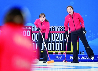 二月十六日,中国队选手张丽君(右)和姜馨迪在比赛中。当日,在北京国家游泳中心“冰立方”举行的北京2022年冬奥会女子冰壶循环赛中,中国队以八比四战胜英国队。