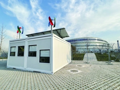 国家速滑馆西北侧有一座独立的零碳示范建筑:“零碳小屋”,冬奥期间作为‘冰丝带’票务服务和应急咨询站点。北京理工大学能源与环境政策研究中心副主任余碧莹介绍,“零碳小屋”拥有零碳智能控制平台,可谓“五脏俱全、食粮充足”。它可利用屋顶的风机和太阳能光伏板供应清洁能源,满足室内空调、办公设备、外墙大屏等用电需求,并装有热回收系统、电能储存系统,可实现能源自给自足与智能调控,达到零碳排放。建筑本身也使用了环保可回收的钢材料,小屋可以拆装移动循环利用。