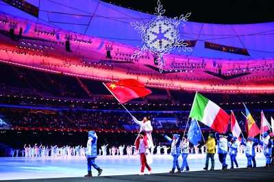 伴随着《欢乐颂》的曲声响起,在代表团旗帜和运动员入场环节,中国旗手徐梦桃坐在另一位旗手高亭宇的肩膀上,擎着国旗用力挥舞,让五星红旗在“鸟巢”中舒展飘扬。就在六天前的夜晚,徐梦桃这位“四朝元老”以完美一跳圆了冠军梦,更实现了运动生涯的大满贯。
