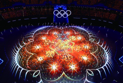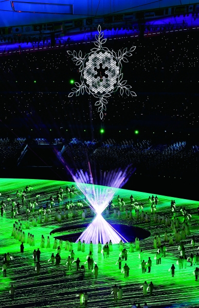 身着缤纷色彩服装的演员们奔入场馆,在温暖欢腾的氛围中,北京2022年冬奥会闭幕式正式开始。