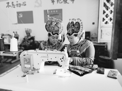 云南省楚雄州永仁县扶贫车间内,绣娘们在交流刺绣技法。
