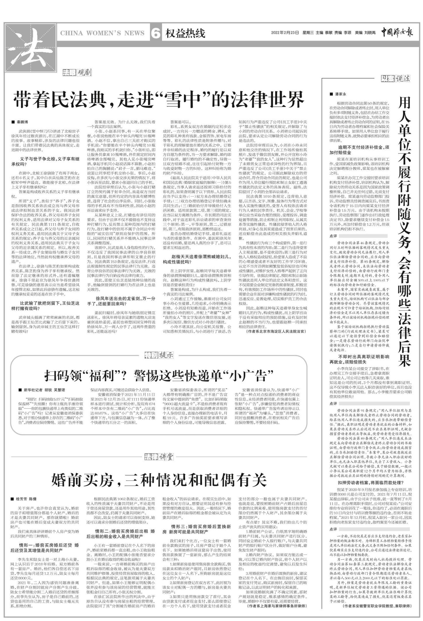 《中国妇女报》(电子版)的一切内容(包括但不限于文字、图片、PDF、图表、标志、标识、商标、版面设计、专栏目录与名称、内容分类标准以及为读者提供的任何信息)仅供中国妇女报读者阅读、学习研究使用,未经中国妇女报及/或相关权利人书面授权,任何单位及个人不得将《中国妇女报》(电子版)所登载、发布的内容用于商业性目的,包括但不限于转载、复制、发行、制作光盘、数据库、触摸展示等行为方式,或将之在非本站所属的服务器上作镜像。否则,中国妇女报将采取包括但不限于网上公示、向有关部门举报、诉讼等一切合法手段,追究侵权者的法律责任。