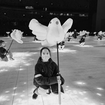 在“鸟巢”里,训练时最高兴的事,莫过于穿着美美地演出服,举着一只“三好鸽子”——灯是亮的,气足,不会乱转。如果再下一点雪就完美了。在黑夜里,凝视着“鸟巢”上面那个巨大的“洞”,看天渐渐变色,看月亮渐渐地从边上爬到最顶上,虽然累,但眼睛还是弯成了一条缝。