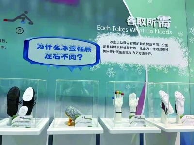 “这就好像真的在滑冰一样,特别有趣!”一个小女孩穿上模拟冰鞋,头戴VR设备,在工作人员的帮助下开始了虚拟滑冰比赛。工作人员告诉记者,这个游戏叫做“动感滑冰”,采用VR技术设计。在游戏旁边,还展示着速度滑冰、短道速滑、花样滑冰、冰球的冰刀,用多媒体向孩子们解释不同冰刀的区别,如花样冰刀的刀身更短、刀刃有一定弧度,前部装有刀齿,刀刃厚度3.5mm以上;速滑冰刀则是刀身长、刀刃窄、底部平坦,平均厚度在1.4mm左右。