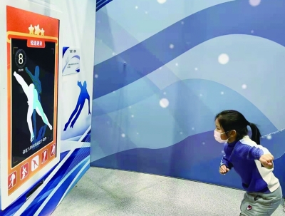 在展区另一边,几个孩子正对着屏幕做着各种不同动作,原来他们是在模拟单板滑雪运动中的抓板姿势。在“冠军姿势”游戏中,参观者可根据多媒体指示在传感器前模拟单板腾空抓板等动作,传感器捕捉动作后由人工智能与运动员专业动作对比进行打分,使参观者更加深入了解单板运动。