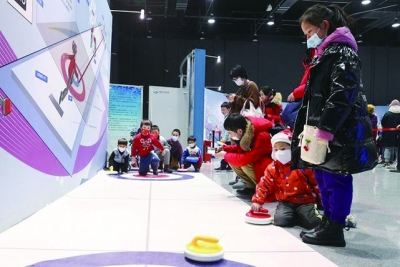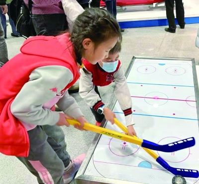 “小心,他快要赢啦!”耳边突然传来孩子们呐喊助威的声音,原来他们正在玩模拟冰壶游戏。在冰壶和冰球的展项中,模拟冰面搭建小型的冰壶运动实景场地,可用来进行模拟冰壶比赛;地磁装置搭建的冰球控球训练小型场地,可让孩子们拿着球杆控制冰球完成相应任务,模拟训练冰球控球能力,体验冰球运动。