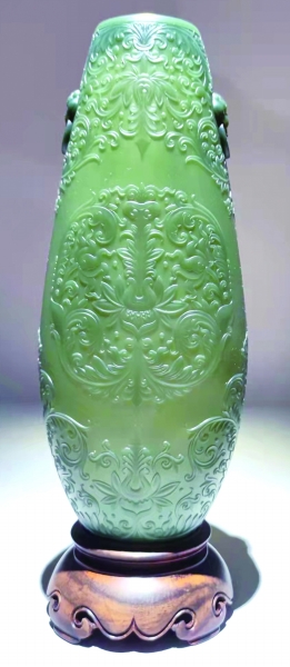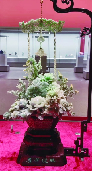 一楼《大国匠作》展出的都是新中国成立后的工艺作品,占据C位的是4大翡翠国宝:翡翠山子《岱岳奇观》、翡翠花薰《含香聚瑞》、翡翠提梁花篮《群芳揽胜》和翡翠插屏《四海腾欢》。这是20世纪80年代北京玉器厂设计制作的4件翡翠国宝,由40多位技艺精湛的大师和数十名专家学者历时8年精心设计施工,矗立起了玉雕史上的新高峰。