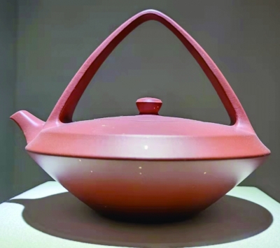 如今看展真的很方便,用手机扫一下标牌上的二维码就能了解展品的概况。范泽锋的“法门佛光”三角提梁壶让我看到了匠心与突破,其创意灵感源自陕西法门寺“双手合握”的设计形式,配合壶腹大幅内敛线条,将提梁做成独特的三角形造型,突破了紫砂壶的造型传统,也提升了工艺实施难度,使整体造型协调相称,并以金作点饰烘托庄严有度的效果。