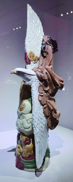 最让我一见钟情的是封伟民的陶瓷作品《逍遥游》,因为我这些年一直在读《庄子》,对《逍遥游》中大鹏展翅的意象非常理解,作品中的大鹏鸟45°倾斜展翅而飞,气宇轩昂的庄子端坐于鸟翅上如如不动,下面是一堆祥云。这种诗意的表达很直白,作品利用前、中、后景的排布手法增强了体积感与独立性,以多维视角来体悟主题人物精神内涵的恣意徜徉。