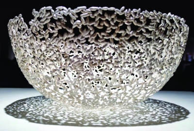 展厅还有一些现代感很强的艺术佳品,王克震的金属工艺《米器》让我印象较深。它远看是一个镂空银碗,走近才发现那是一粒一粒组成的。这件作品从中国饮食文化中吸取灵感,每一粒米粒象征着独立的个体,将数以千计的米粒形象以纯银颗粒互相熔接,形成各种尺寸与形态的银碗造型。光透过缝隙处可形成虚灵镂空的碗影,颠覆了对传统实胎碗的固有认知,引发人们对当代餐具与传统饮食文化之间的内外关系,以及社会协作与粮食生产安全问题的深度思考。