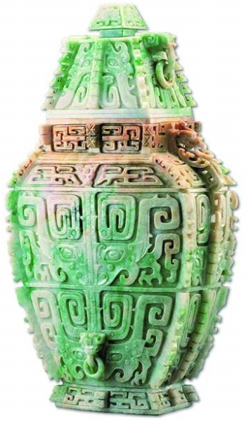 我个人比较偏好“古物”,如亭亭玉立的翡翠方罍(北京 20世纪50年代)造型非常别致,很像一款网红抹茶巧克力雪糕。方罍原型是商代青铜器的典型代表,这件方罍以浅浮雕和立体圆雕的工艺细琢而成,罍盖呈庑殿顶形,罍身作长方口,器身全身雕刻花纹,主要以兽面纹(饕餮纹)和夔龙纹为主;肩部两侧装饰双耳衔环,正面腹部下方置一兽首鋬,整件作品器形端庄大气、古朴凝重。
