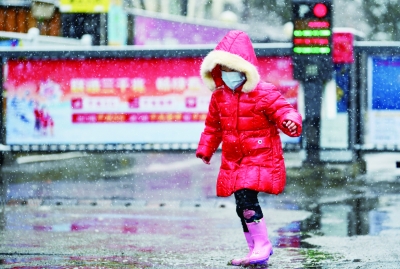 3月17日,小朋友在呼和浩特市街头行走。 当日,我国北方多地出现降雪天气。 新华社发(王正/摄)