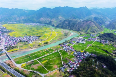 3月23日拍摄的杭州市临安区龙岗镇数千亩通过“非粮化”整治的土地,都已种上了油菜或小麦(无人机照片)。