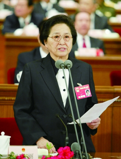 图① 2003年3月11日,十届全国人大一次会议第四次全体会议在北京人民大会堂举行。何鲁丽同志主持会议。    新华社记者 饶爱民/摄