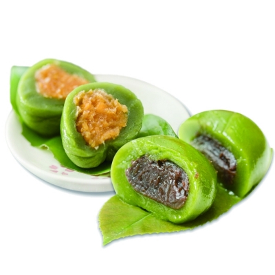 揭笼,那一个个圆润水亮的绿色“小胖子”挤在一起,用筷子轻轻戳一下,软糯的青团微微下陷,汗珠似的水滴吱溜就滑了下来。我最爱吃甜的青团。红豆、黄豆和芝麻磨成浓稠的蓉,最妙的还是用猪油炒过的花生、白糖,咬起来“咔咔”响,甜脆相宜。外婆说,有些地方的人们还会用笋丁、腊肉、豆干和胡萝卜做咸味馅料,还会加新鲜辣椒,最后包成饺子形状,那个叫“清明果”。
