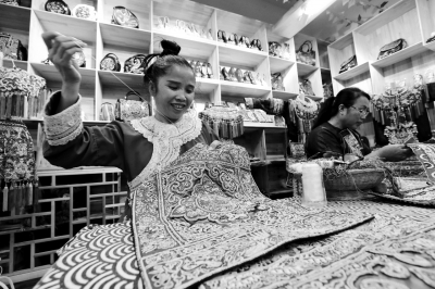 4月11日,侗族妇女在贵州省榕江县车民街道卧龙小区刺绣工艺就业车间刺绣。