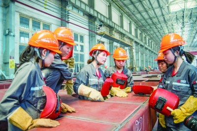 电焊“花木兰”易冉(左三)与工人们在开展技术攻关。