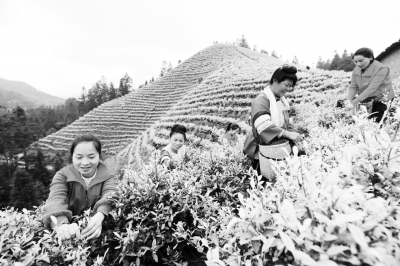 4月14日,在贵州省榕江县乐里镇本里村黄金芽茶叶种植基地,党员志愿者和茶农一起采茶。最近,本里村种植的黄金芽茶叶进入春茶采摘高峰期,当地党委组织党员志愿者走进茶园,帮助茶农采茶,助力增产增收。本里村以“党支部+合作社+农户”模式,种植黄金芽茶叶2800余亩,其中1200余亩已进入盛产期,今年预计收入500余万元。