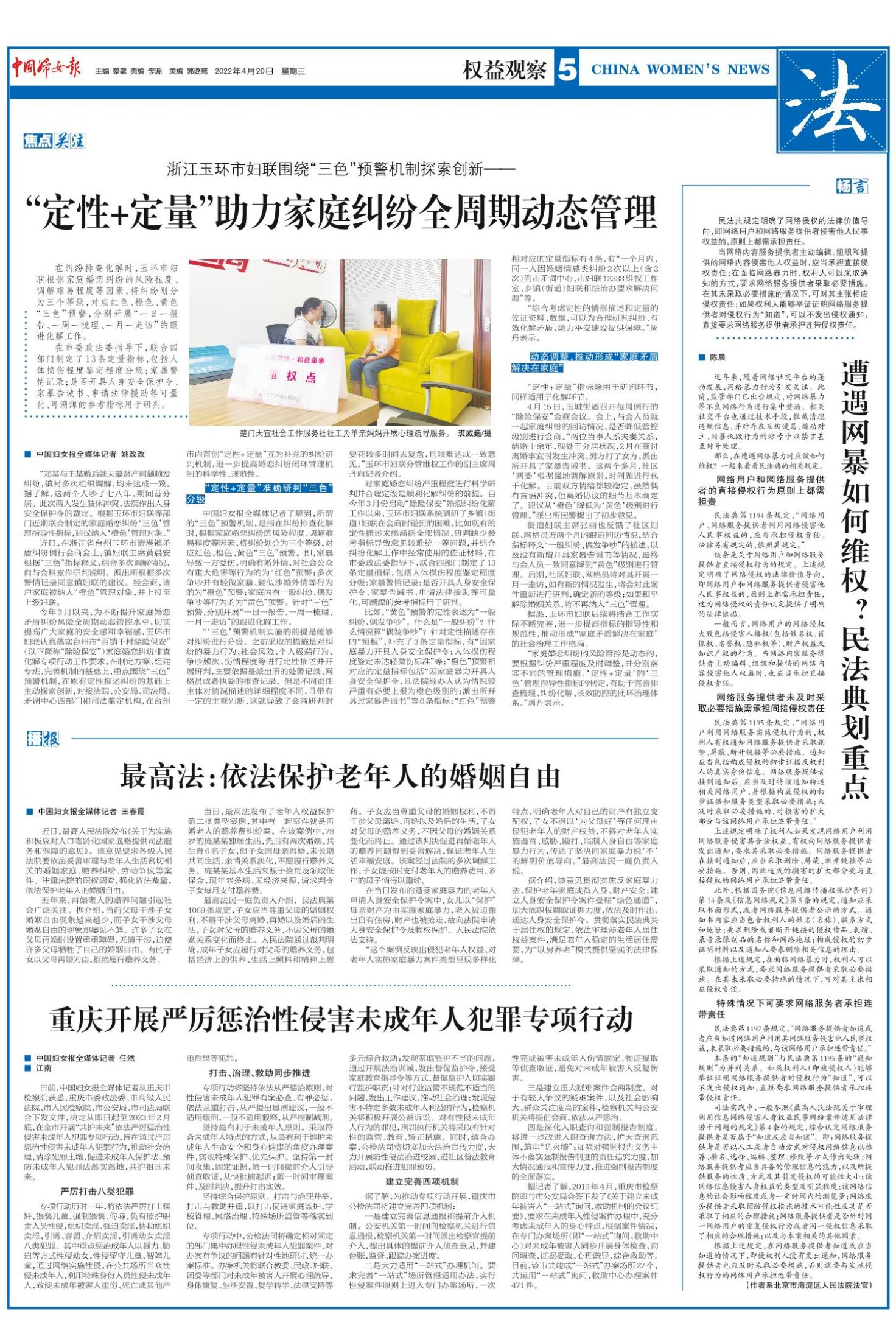 《中国妇女报》(电子版)的一切内容(包括但不限于文字、图片、PDF、图表、标志、标识、商标、版面设计、专栏目录与名称、内容分类标准以及为读者提供的任何信息)仅供中国妇女报读者阅读、学习研究使用,未经中国妇女报及/或相关权利人书面授权,任何单位及个人不得将《中国妇女报》(电子版)所登载、发布的内容用于商业性目的,包括但不限于转载、复制、发行、制作光盘、数据库、触摸展示等行为方式,或将之在非本站所属的服务器上作镜像。否则,中国妇女报将采取包括但不限于网上公示、向有关部门举报、诉讼等一切合法手段,追究侵权者的法律责任。