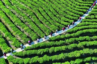 4月21日,在四川省南充市营山县明德乡石狮村茶园,村民采摘春茶后前往合作社晾晒茶叶途中(无人机照片)。近年来,明德乡坚持将党支部建在产业上,将党员聚在产业上,充分发挥返乡农民工党员的示范作用,成立合作社带动村民开垦撂荒地,种植茶树,促进了产业发展与村民增收,让昔日高山撂荒地变成了今日美丽的茶园。    新华社发(李向雨/摄)