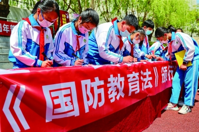 4月26日,河北省秦皇岛市举办“开启时代新征程 爱国强军谱新篇”为主题的国防教育活动。通过现场讲解《中华人民共和国国防教育法》、在国防教育主题横幅上签名等方式,引导青少年学生树立国防观念,激发爱国热情,增强国防意识。中新社发 曹建雄/摄